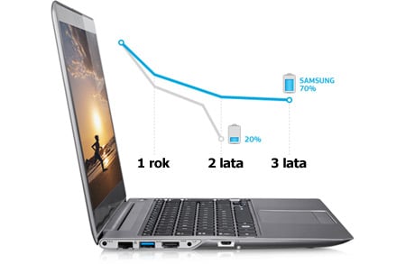 Bardzo długi czas pracy na baterii Ultrabook 530U3C firmy Samsung zapewnia doskonałą mobilność i swobodę dzięki energooszczędnej wydajności oraz bardzo dużej żywotności baterii pozwalającej na 6 godzin pracy - to mnóstwo czasu na dokończenie spraw lub rozrywkę bez obawy, że bateria za chwilę przestanie działać. Zaawansowana bateria i innowacyjna technologia Samsung's BatteryLife Plus przedłużają czas pracy baterii nawet trzykrotnie w porównaniu z typowymi bateriami stosowanymi w notebookach. Dzięki tek technologii bateria zachowuje 70% oryginalnej pojemności aż do 1500 ładowań i to przez 3 lata. |