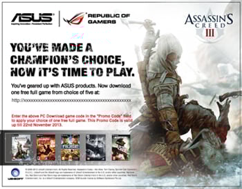 Wybierz jedną z pięciu gier Wybierz jedną z pięciu pełnych gier firmy Ubisoft: Assassin’sCreed III, I Am Alive, R.U.S.E, Splinter Cell: Conviction, RainbowSix Vegas 2 |