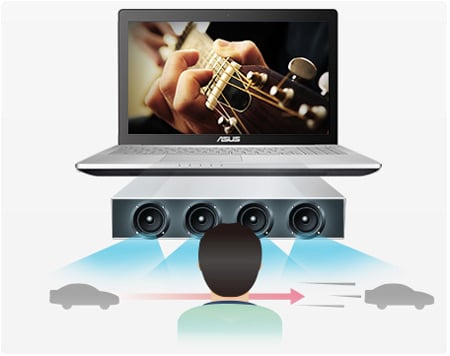 Dźwięk surround z wykorzystaniem czterech głośników Dopracowane przez zespół ASUS Golden Ear cztery potężne głośniki zapewniają realistyczny dźwięk. Odpowiednio kształtują brzmienie każdego dźwięku i oferują najlepszą reprodukcję. Technologia eliminacji przesłuchu i technologia Head-Related Transfer Function (HRTF) oczyszczają dźwięk, usuwają zakłócenia i zwiększają przyjemność podczas słuchania zarówno podczas korzystania z głośników, jak i przy użyciu słuchawek. Pozycjonowanie dźwięku zapewnia bogatszy i bardziej realistyczny dźwięk, zwłaszcza podczas oglądania filmów. |