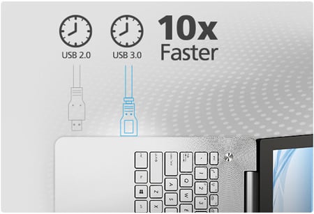 Superszybkie i uniwersalne złącze USB 3.0 Notebook został wyposażony w szybki interfejs USB 3.0. Oferuje on przepustowość na poziomie 5 Gbit/s, co jest ponad 10-krotnie wyższym wynikiem w porównaniu do starszego USB 2.0. Pozwala to na dużo szybszy transfer materiałów HD. Ładowanie urządzeń USB również jest szybsze - port dostarcza prąd o natężeniu aż 900mA, jednocześnie oferując funkcje oszczędzania energii poprzez wprowadzanie nieużywanych urządzeń w stan wstrzymania, lub wyłączając je, gdy nie są aktualnie w użyciu. |