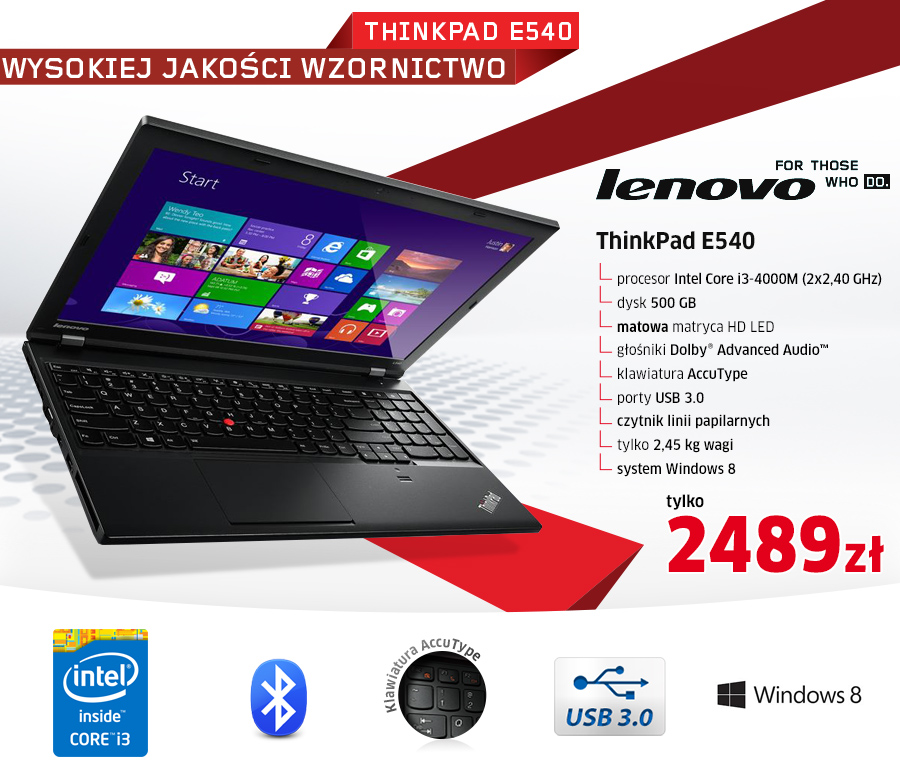 Nagradzana klawiatura zoptymalizowana dla Windows 8 Pełnowymiarowa i odporna na rozlanie legendarna ergonomiczna klawiatura stosowana w serii ThinkPad jest znana z pełnego zestawu klawiszy, doskonałego wrażenia w dotyku oraz urządzenia wskazującego TrackPoint®. Teraz dostosowana do systemu Windows 8 i wyposażona w wygodne przyciski multimedialne, możliwość blokady funkcji oraz natychmiastowy dostęp do otwartych aplikacji. Dodatkowo większy panel TrackPad o płynnym działaniu z obsługą pięciu punktów dotykowych, który można skonfigurować na wiele sposobów. Do 6 godzin pracy na zasilaniu bateryjnym Możesz pracować niemal cały dzień bez potrzeby podłączania ładowarki. Doskonała jakość konferencji internetowych / Optymalizacja pod kątem komunikacji VOIP Kamera internetowa 720p HD gwarantuje lepszą jakość obrazu przy słabym oświetleniu oraz szerokie kąty widzenia. Ponadto posiada funkcję śledzenia twarzy oraz dwa mikrofony z funkcją wyciszania niepożądanych odgłosów, tak by zapewnić właściwy przebieg konferencji internetowych. Z kolei klawisze multimedialne umożliwiają szybką zmianę ustawień mikrofonu, głośników i kamery. Lenovo Solutions for Small Business Unikalne rozwiązania w zakresie zabezpieczeń i poprawy wydajności oparte na platformie Intel® Small Business Advantage przeznaczonej dla małych i średnich firm, w tym: planowanie automatycznej konserwacji poza godzinami pracy, monitorowanie oprogramowania, blokada portów USB, oszczędzanie energii i proste tworzenie kopii zapasowych aplikacji i ich przywracanie. Wbudowany czytnik linii papilarnych Uzyskaj szybki dostęp do aplikacji i ciesz się bezpiecznym logowaniem za jednym pociągnięciem palca. Dolby® Advanced Audio™ Ten pakiet technologii audio pozwala na uzyskanie czystego i wyrazistego dźwięku przestrzennego z wbudowanych głośników stereo. System zapewnia optymalną jakość dźwięku podczas komunikacji VoIP, dużą głośność bez zniekształceń oraz pomaga uwydatnić dialogi podczas oglądania filmów. Przechowywanie danych w chmurze Lenovo Cloud Storage Chroń kluczowe dane i korzystaj z szybkiego i wygodnego dostępu do informacji i udostępniania plików. Automatycznie twórz kopie zapasowe i synchronizuj dane w całej firmie, uzyskując dostęp z poziomu wielu urządzeń. W celu dodatkowego zabezpieczenia danych, podczas transferu są one szyfrowane. Nowa technologia Lenovo OneLink Uzyskaj więcej ze swojego kabla zasilającego! Technologia OneLink to unikalny interfejs, który ułatwia podłączanie laptopa dzięki użyciu jednego kabla oraz stacji dokującej ThinkPad OneLink Dock. Stacja OneLink Dock zapewnia dodatkowe złącza wideo, USB 3.0, gniazdo sieci Gigabit Ethernet oraz złącza audio oraz umożliwia ładowanie laptopa. Laptop ThinkPad Edge E540 jest jednym z pierwszych laptopów wyposażonych w tę innowacyjną funkcję. |