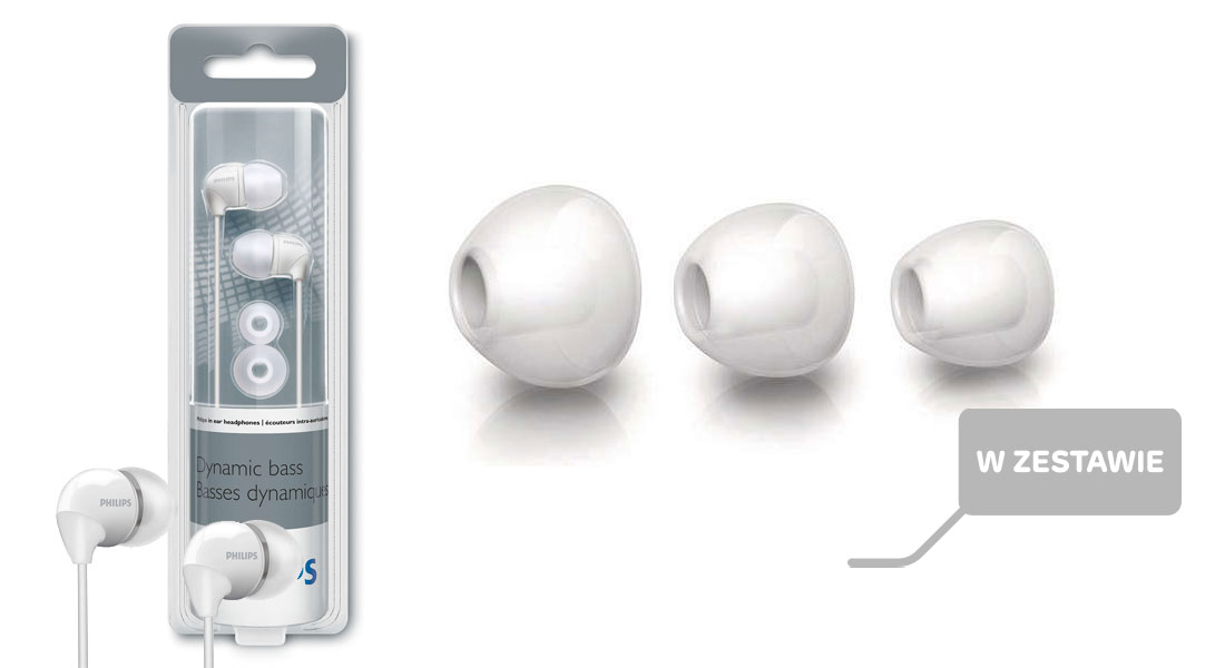 Do słuchawek zostały dołączone 3 pary silikonowych nakładek. Mając do dyspozycji 3 pary wymiennych nasadek dousznych firmy Philips w różnych rozmiarach, na pewno znajdziesz parę, która będzie najlepiej pasować do Twoich uszu.