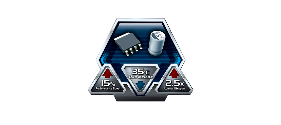 Specjalnie opracowany stop zwiększa wydajność, redukuje straty energii, zwiększa wytrzymałość i zapewnia niższa temperaturę pracy. Kondensatory zapewniają żywotność rzędu 50 000 godzin - to 2,5-krotnie więcej, niż tradycyjne kondensatory.