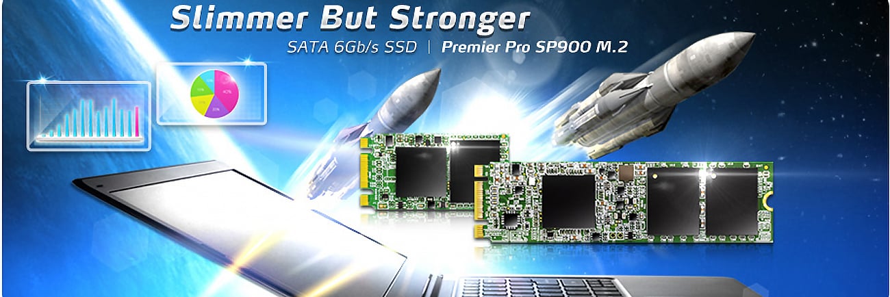 Dysk Premier Pro został zbudowany dla rozwiązań komputerowych nowej generacji - "szybszy i mniejszy". SP900 M.2 2280 jest mniejszy niż 2 i pół calowe dyski SSD i mSATA, ale nadal posiada dużą pojemność. Dysk może zostać zamontowany w Ultrabookach a także może zostać zamontowany na płycie głównej. Dzięki wsparciu dla technologi Intel® Smart Response , Dysk Premier Pro umożliwia sekwencyjny odczyt/zapis o prędkościach do 550/530 w celu zapewnienia doskonałej wydajności. Dodatkowo dzieki technologi DVSLP (Device Sleep) dysk M.2 zużywa mniej energii co przekłada się na dłuższą żywotność baterii.