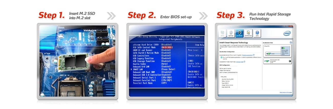 Technologia Intel® Smart Response Jest mechanizmem buforowania, który pozwala dyskowi SSD działać jako pamięć cache dla dysku mechanicznego. Ustawienia dysku są wygodne i szybkie.