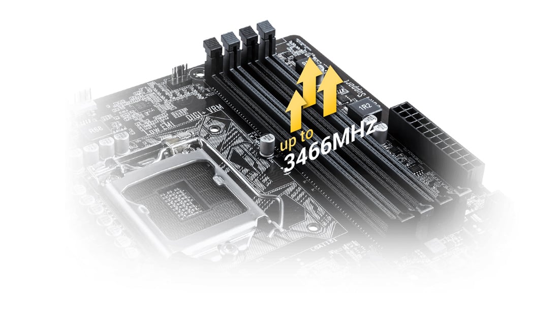 Druga generacja ASUS T-Topology pozwala na przetaktowanie pamięci DDR4 do nowych poziomów: powyżej DDR4-3400 MHz przy zajętych wszystkich gniazdach pamięci. Obejmująca specjalny układ ścieżek zmniejszający przesłuchy i szum sprzężeń nasza T-Topology drugiej generacji gwarantuje wyrównany w czasie transfer sygnału, co zwiększa stabilność i zgodność pamięci.