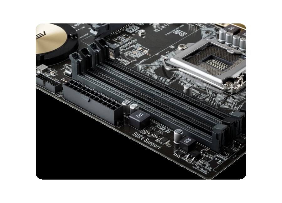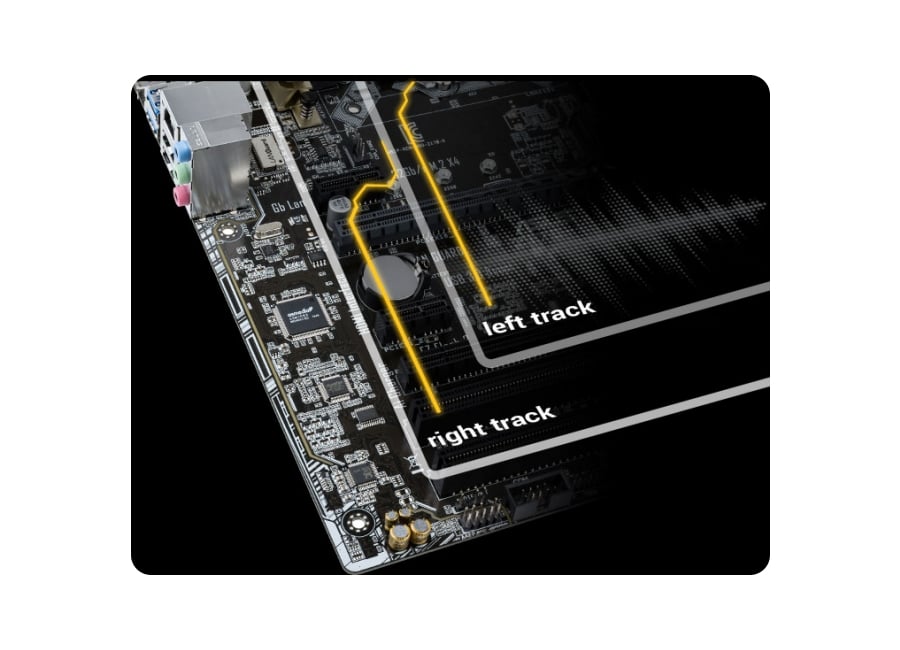 Wyjątkowo zaprojektowany obwód z wbudowanymi regulatorami napięcia do ochrony Twojego chipsetu, gniazd połączeniowych i kodeków audio przed uszkodzeniem spowodowanym nieoczekiwanymi napięciami wysokiej wartości z niestabilnych albo złych zasilaczy.