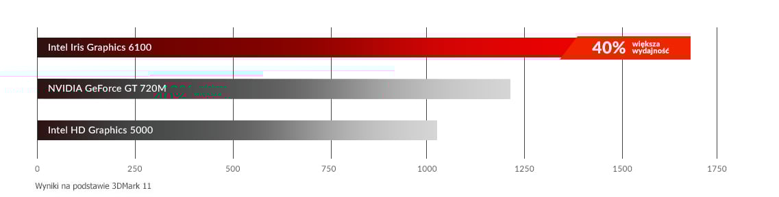 Procesory Intel Core i5 piątej generacji zapewniają komfort obsługi codziennych zadań, oferują dłuższy czas pracy baterii oraz wbudowane funkcje zabezpieczeń. Inteligentna wielozadaniowość obsługiwana przez technologię Intel Hyper-Threading umożliwia płynne przechodzenie między aplikacjami. Komfort oglądania ulubionych filmów HD w doskonałej jakości, wyświetlania i obróbki nawet najdrobniejszych szczegółów zdjęć oraz płynnej obsługi popularnych gier. Komfort pracy bez podłączania ładowarki dzięki znacznemu wydłużeniu czasu pracy baterii. Wyraziste filmy. Szybsza praca. Więcej możliwości w grach. To wszystko dzięki procesorom Intel® Core™ i5, które wznoszą wydajność komputerów na niespotykany poziom.
