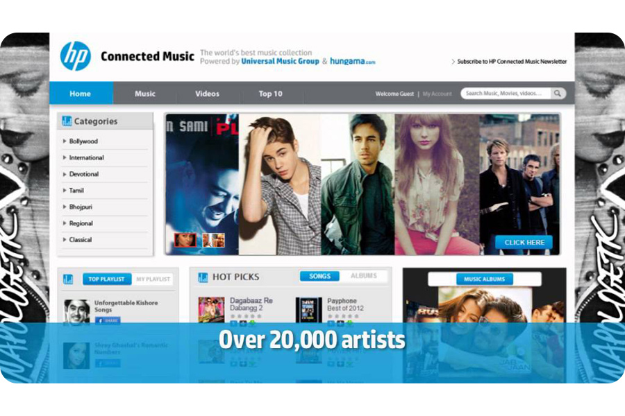 Dostęp do różnych źródeł muzyki z jednej lokalizacji dzięki oprogramowaniu HP Connected Music. Słuchaj stacji radiowych i audycji z całego świata dzięki jednej, unikatowej aplikacji TuneIn Radio, która umożliwia zintegrowanie biblioteki muzycznej użytkownika z wiodącymi usługami muzycznymi.