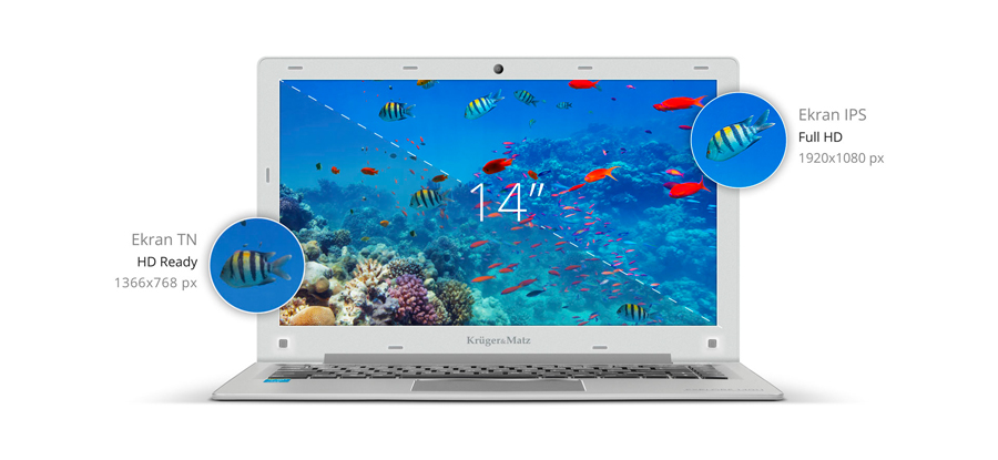 To, co zwróci Twoją uwagę, gdy tylko włączysz ultrabooka Kruger&Matz Explore 1401, to wykonany w technice IPS, 14” wyświetlacz Full HD o rozdzielczości 1920x1080px. W porównaniu ze standardowymi ekranami, oferowanym w wielu tego typu urządzeniach, gwarantuje on większą szczegółowość, a tym samym bardziej komfortową pracę nawet przez wiele godzin.