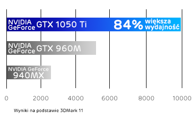 Niesamowite szczegóły: oddzielna karta graficzna NVIDIA® GeForce® GTX 1050 ma własną pamięć, która nie jest współdzielona z procesorem, co umożliwia granie przy wysokich ustawieniach jakości obrazu.