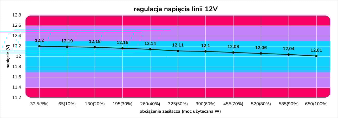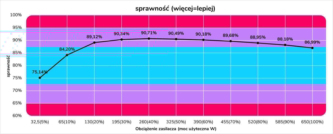 Zapoznaj się ze szczegółowymi wykresami obrazującymi wyniki testów wydajności zasilacza Corsair CX650F RGB 650W 80 Plus Bronze w całym zakresie obciążenia. Kliknij w jeden z poniższych przycisków, aby rozwinąć lub zwinąć wybrany wykres.