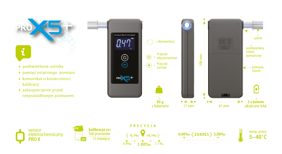 Kompaktowe wymiary (47×108×17 mm) oraz niewielka waga (85 g z bateriami) czynią go niezwykle poręcznym, łatwym w transporcie i przechowywaniu. Alkomat pracuje również w szerokim zakresie temperatur od 5°C do 40°C.