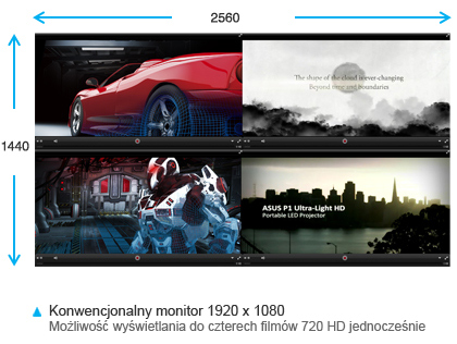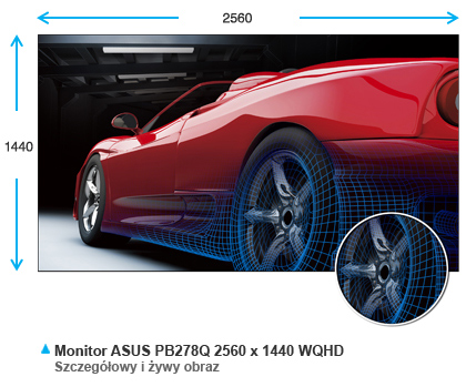 Realistyczny obraz - lepszy i szerszy widok PB278Q to 27-calowy, podświetlany diodami LED ekran WQHD o proporcjach 16:9. Posiada 109 pikseli na każdy cal (PPI), dzięki czemu umożliwia wyświetlanie obrazu w rozdzielczości 2560 x 1440 – to czterokrotnie więcej, niż w przypadku monitorów 720p. Pozwala na zmieszczenie większej liczby otwartych okien na ekranie i znacznie poprawia szczegółowość obrazu. Gęstość ekranu 109PPI oznacza, że na każdy cal matrycy przypada 109 pikseli RGB. W normalnych warunkach, im więcej ekran ma pikseli, tym więcej wymaga oświetlenia (lub zasilania), aby zapewnić dobrą jakość obrazu. Jednak dzięki podświetleniu LED, monitory PB278Q są w stanie zapewnić doskonały obraz przy jednoczesnej oszczędności energii. |