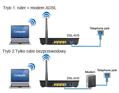 Ethernet WAN Ethernet WAN pozwala na pracę DSL-N10 B1 w dwóch trybach. DSL-N10 może być użyty jako modem ADSL z ruterem albo jako sam ruter bezprzewodowy. ![]() |