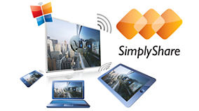 Łatwe udostępnianie plików Udostępniaj zdjęcia, utwory muzyczne, pliki wideo i filmy ze smartfona, tabletu lub komputera na dużym ekranie dzięki technologii DLNA. Udostępnianie stało się proste. |