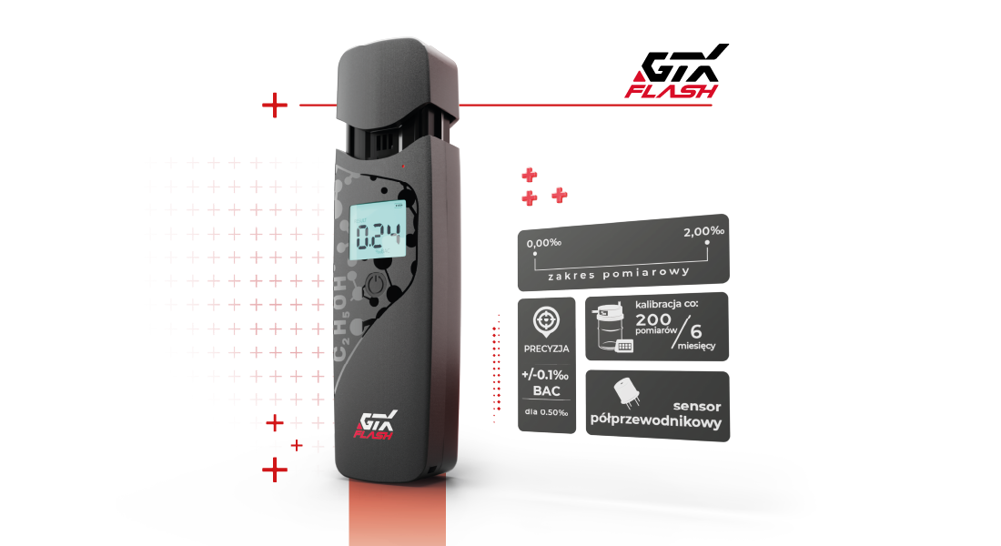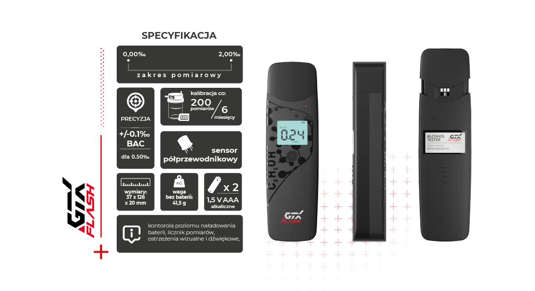 GTX Flash to alkomat kieszonkowy o wymiarach 12,6 x 3,7 x 2 cm i wadze jedynie 41,5 grama (bez baterii). Za precyzję pomiaru odpowiada sensor półprzewodnikowy najnowszej generacji. Wynik testu trzeźwości wyświetlany jest na czytelnym ekranie w promilach (‰) z dokładnością do +/- 0,1‰ dla 0,5‰. GTX Flash został wyposażony również w licznik wykonanych pomiarów oraz wskaźnik poziomu naładowania baterii.