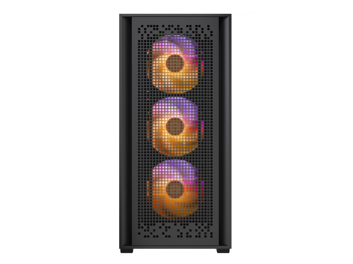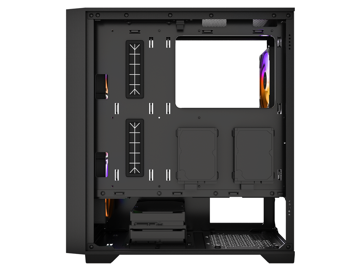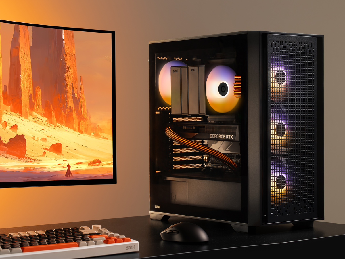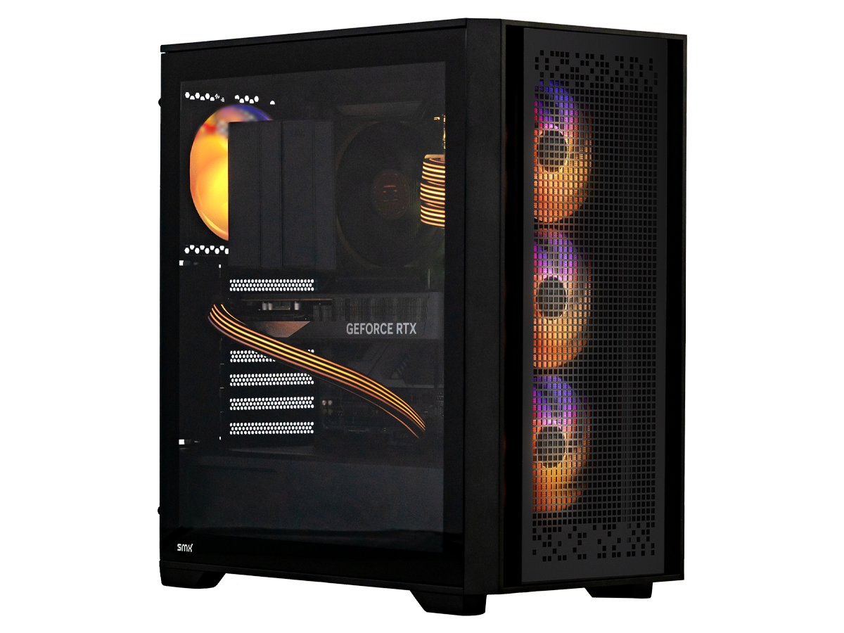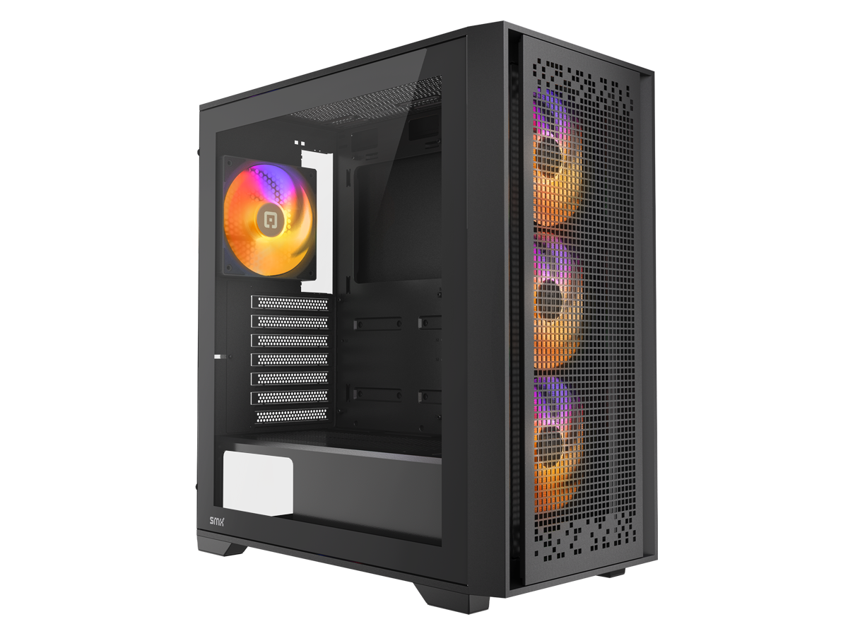 Obudowa obsługuje maksymalnie pięć wentylatorów, w tym trzy 120 mm lub dwa 140 mm z przodu, dwa 120/140 mm na górze i jeden 120 mm z tyłu. Już na starcie otrzymujesz cztery wentylatory SMX Seifu 120 mm ARGB, co poprawia cyrkulację powietrza i pozwala rozpocząć montaż bez dodatkowych akcesoriów.