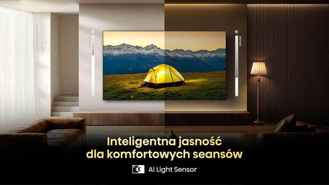 Funkcja AI Light Sensor w telewizorze Hisense automatycznie dopasowuje jasność ekranu do aktualnych warunków oświetleniowych w pomieszczeniu. Dzięki temu obraz zawsze pozostaje czytelny, wyraźny i komfortowy dla oczu – zarówno w jasny, słoneczny dzień, jak i podczas wieczornego oglądania. To rozwiązanie, które dba o wzrok i wygodę całej rodziny, a jednocześnie ogranicza zużycie energii, czyniąc telewizor bardziej ekologicznym i energooszczędnym.