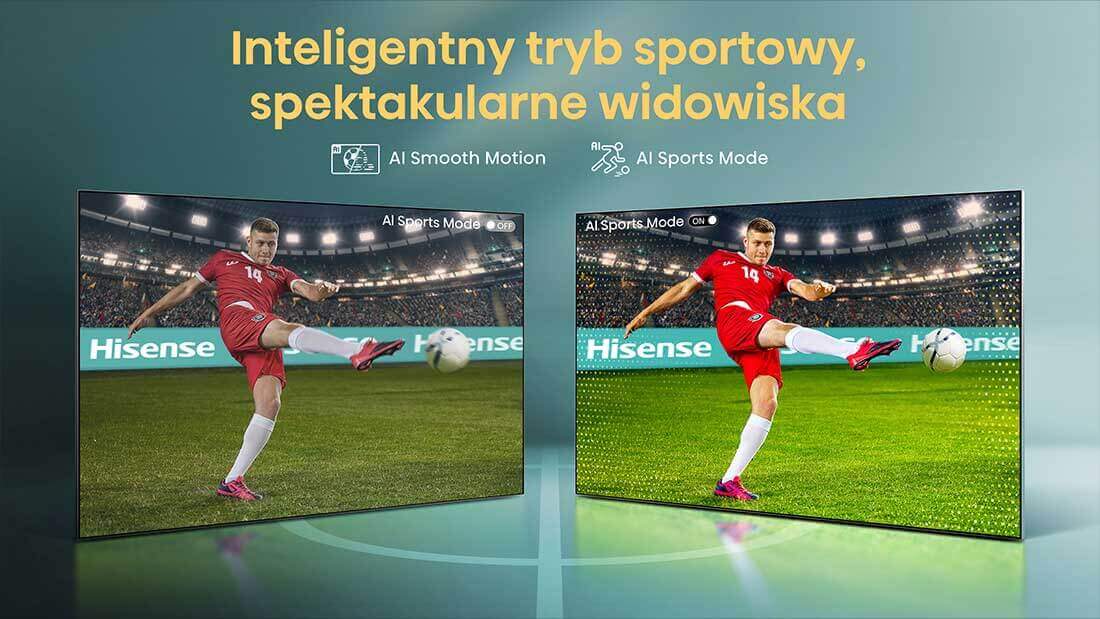 Tryb AI Sports Mode w telewizorach Hisense 4K automatycznie dopasowuje obraz i dźwięk do transmisji sportowych, oferując wyjątkowo realistyczne i dynamiczne wrażenia. Funkcja eliminuje efekt smużenia, wzmacnia intensywność kolorów, poprawia słyszalność komentarza i zwiększa płynność ruchu. Dzięki temu możesz oglądać mecze, wyścigi i inne wydarzenia sportowe z pełnym komfortem komfortem, jakbyś naprawdę znajdował się na stadionie. To idealny tryb do oglądania sportu na żywo.