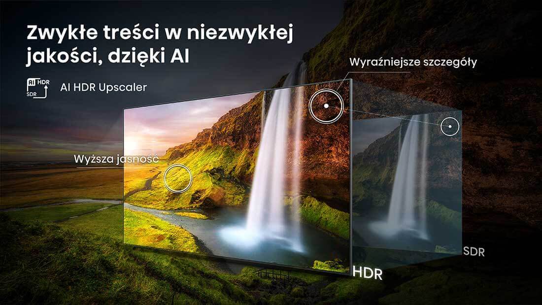 Technologia AI HDR Upscaler w telewizorach Hisense sprawia, że nawet standardowe materiały SDR zyskują jakość zbliżoną do HDR. Obraz staje się bardziej dynamiczny, z większą głębią, wyraźniejszym kontrastem i bogatszymi kolorami. Sztuczna inteligencja analizuje każdą scenę w czasie rzeczywistym, poprawiając jej parametry tak, by wyglądała jak nagrana w formacie HDR. Oglądaj swoje ulubione filmy i programy w imponującej jakości HDR – bez żadnych ograniczeń.