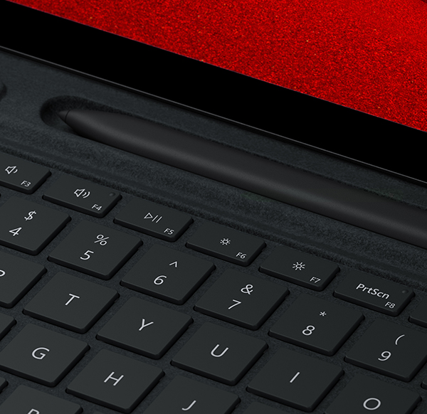Surface Slim Pen bezpiecznie schowasz i naładujesz wewnątrz klawiatury klasy premium: Surface Pro X Signature Keyboard. Akcesorium to jest teraz dostępne w kolorach: czerwony mak, lodowoniebieski, platynowy i czarny2.