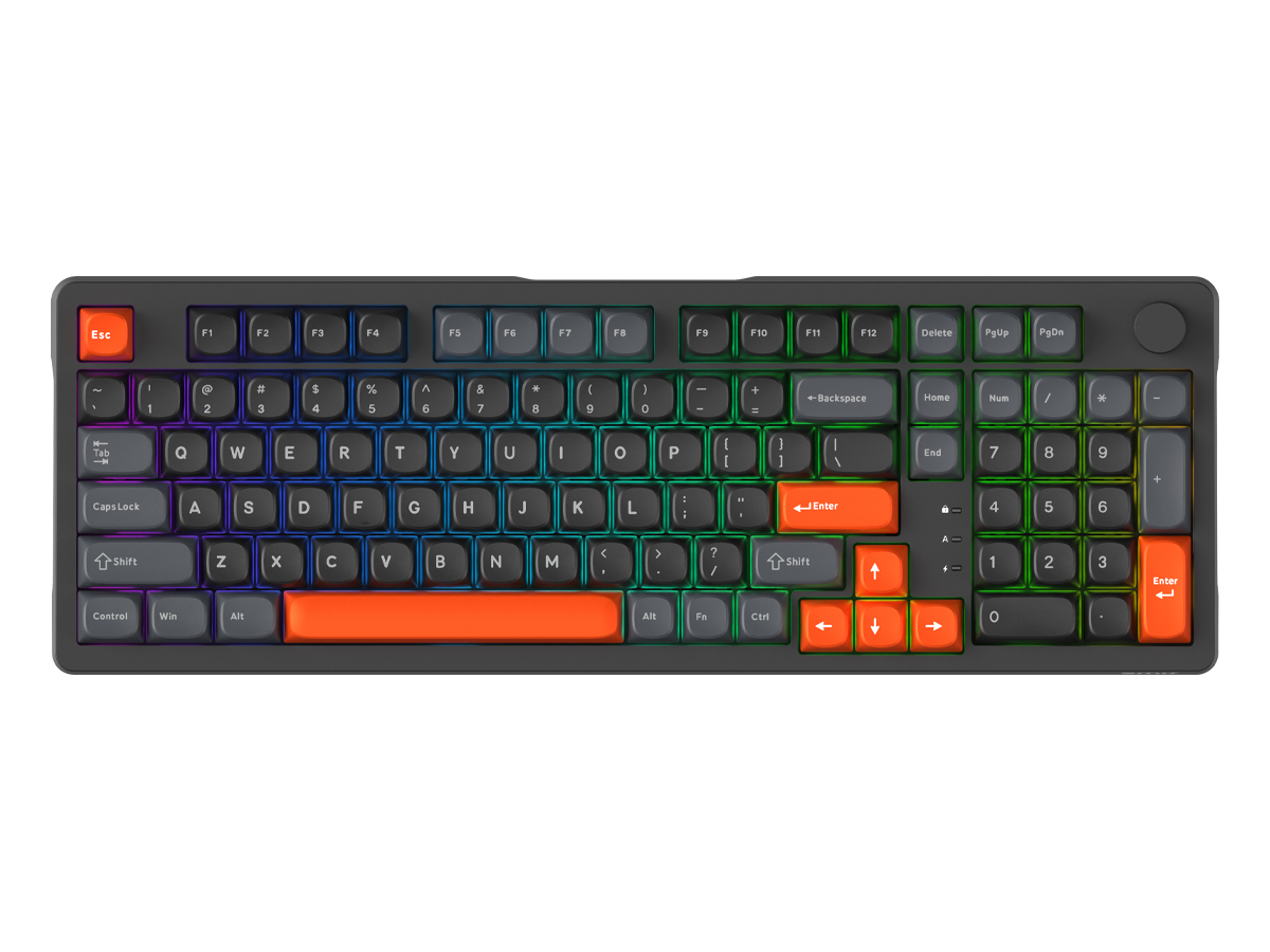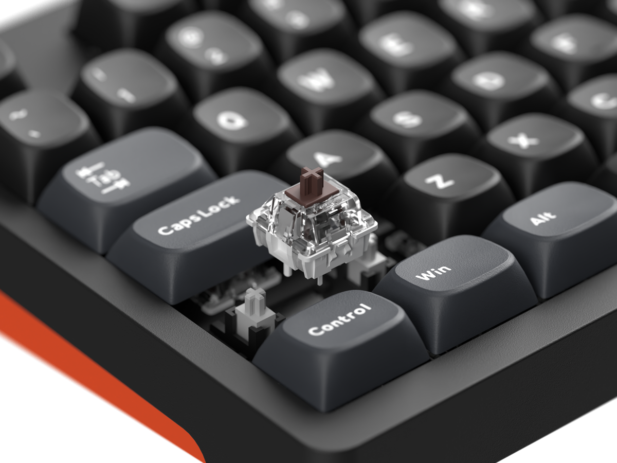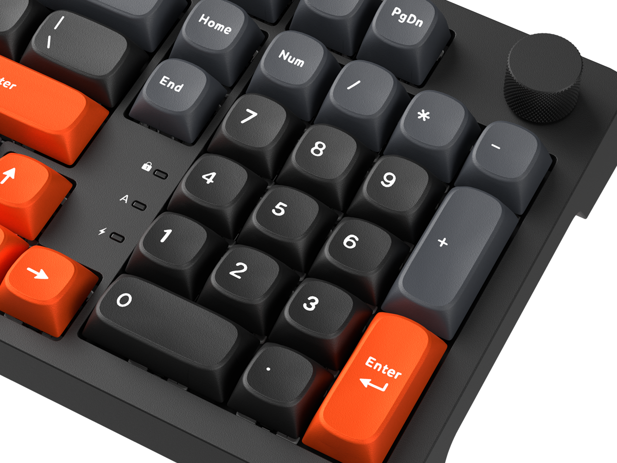 Dopełnieniem wrażeń są pomarańczowe keycapy PBT z profilem MDA — trwałe, odporne na ścieranie i przyjemne w dotyku. Ich ergonomiczny, klasyczny kształt idealnie współgra z charakterem Nougatów, a subtelne odniesienie do pomarańczowego spodu obudowy tworzy spójną, wyrazistą całość.