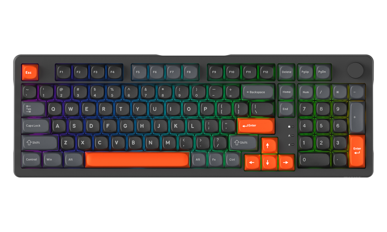 Podświetlenie RGB z południowym układem LED-ów wygląda naturalnie nawet przy nieprzezroczystych keycapach, a całość można konfigurować z poziomu przeglądarki, bez konieczności instalowania dodatkowego oprogramowania. Obudowa skręcana na śruby daje poczucie solidności, a jednocześnie zachęca do rozbierania i modowania bez stresu.