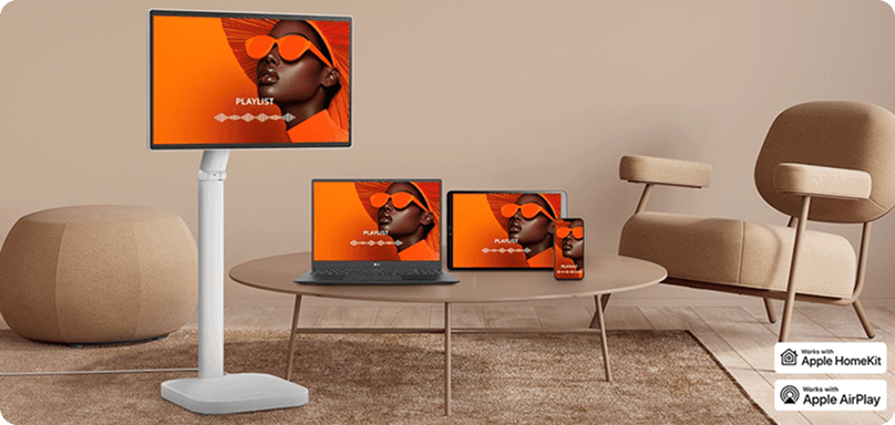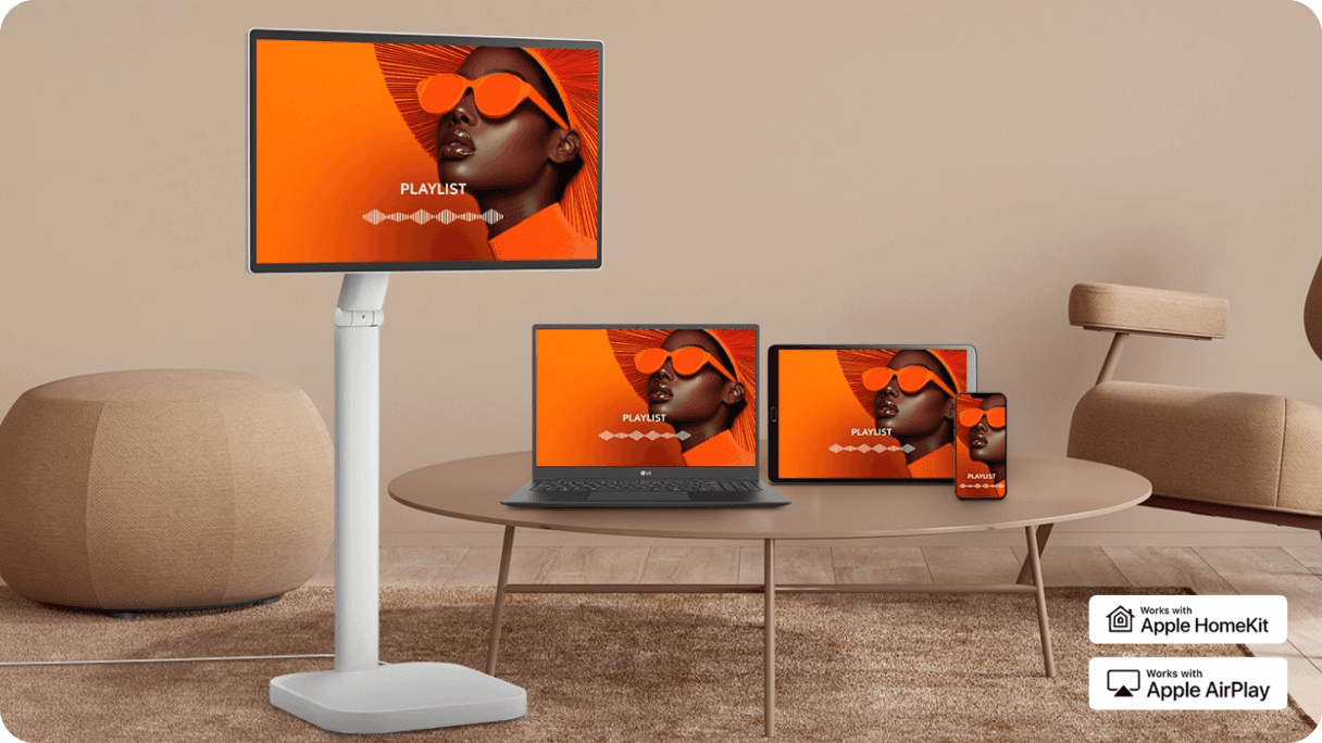 Ten sam ekran jest udostępniony na monitorze LG Smart Monitor Swing, laptopie, tablecie i smartfonie za pomocą funkcji AirPlay 2 i Screen Share.