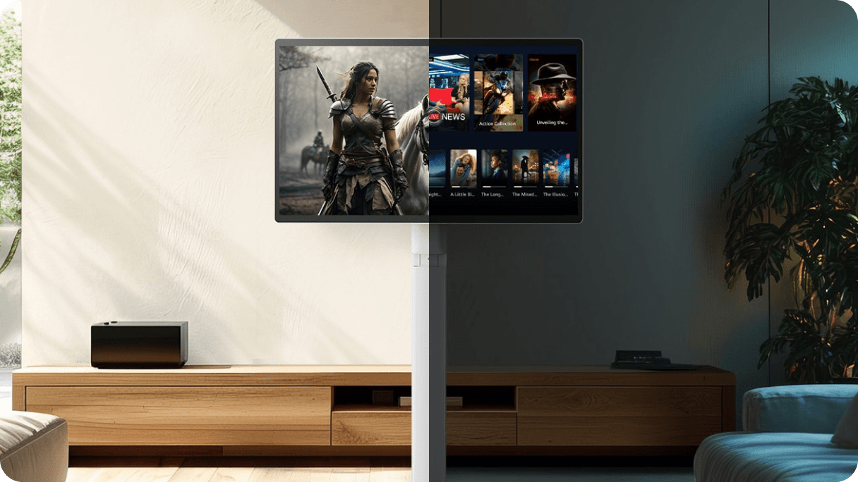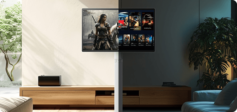 Funkcja kontroli jasności wykrywa źródła światła w pomieszczeniu i automatycznie dostosowuje jasność ekranu, zapewniając ostry i wyraźny obraz, zarówno w dzień, jak i w nocy.