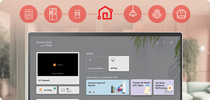 Pulpit nawigacyjny ThinQ Home sprawia, że życie staje się wygodniejsze. Łatwo sprawdzaj i zarządzaj stanem urządzeń LG na jednym ekranie za pomocą pilota.