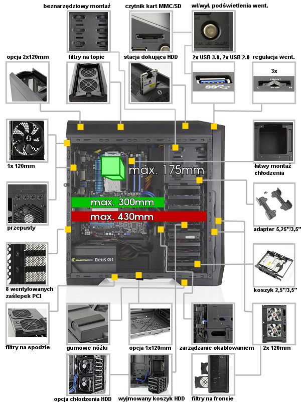 Wewnątrz znajduje się miejsce na trzy napędy 5,25″, przy czym w zestawie jest jeden adapter na 5,25″/3,5″, oraz do ośmiu dysków twardych 3,5″ lub 2,5″. Poza wentylatorami na obudowie możliwe jest zastosowanie dodatkowych wentylatorów 80mm w tackach dysków twardych. |