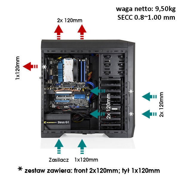 Obudowa jest fabrycznie wyposażona w 3 wentylatory 120mm, dwa z przodu oraz jeden z tyłu. Dodatkowo użytkownik może zamontować kolejnych pięć wentylatorów 120mm, dwa na górze, jeden na dole, obok zasilacza oraz dwa na koszykach dysków twardych.