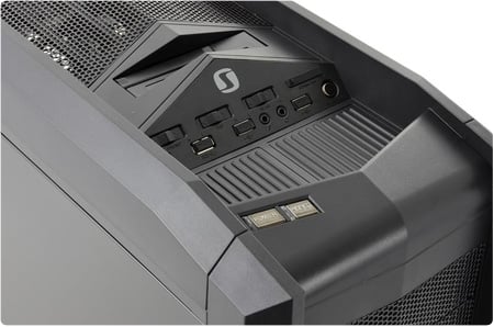 Wszystkie złącza wyprowadzone są na górny panel, przez co front obudowy pozbawiony jest jakichkolwiek dodatków czy też przełączników. Obudowa posiada dwa porty USB 3.0, dwa porty USB 2.0, czytnik kart SD (zabezpieczone silikonowymi nakładkami) oraz złącza słuchawek i mikrofonu. Pod elegancką klapką skryty jest dok dysków SATA – 3,5″ lub 2,5″.