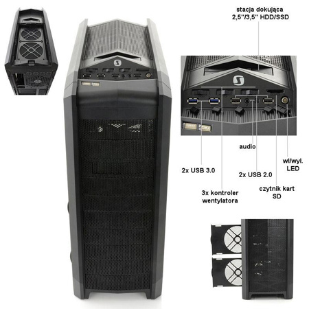Gladius X80 Pure Black SilentiumPC Gladius X80 Pure Black to bardzo rozbudowana obudowa midi tower w eleganckim, czarnym kolorze oraz z dość agresywną stylistyką.