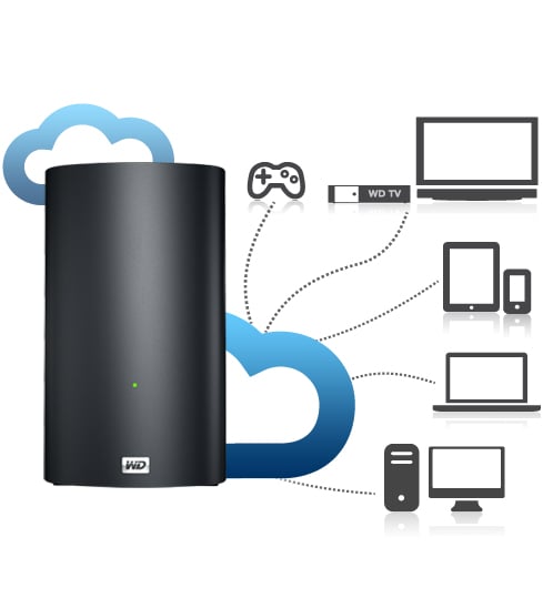Przesyłanie multimediów do telewizora HD. Obejrzyj wideo z urodzin swojej córki albo wyświetl pokaz slajdów z wakacji na ekranie telewizora. Wbudowany serwer multimediów umożliwia strumieniowe przesyłanie muzyki, zdjęć i filmów do każdego urządzenia zgodnego ze standardem DLNA, takiego jak odtwarzacz multimediów WD TV Live, odtwarzacz Blu-ray Disc, konsola Xbox 360 lub PlayStation 3 albo podłączony telewizor. Certyfikat DLNA 1.5 & i UPnP. |