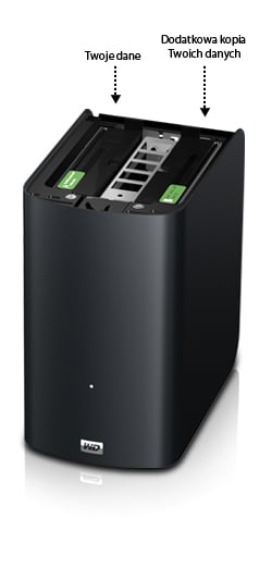 Technologia RAID 1 zapewnia podwójną ochronę plików. Skonfigurowanie systemu w trybie ochrony danych (nazywanym również trybem dublowania lub RAID 1) powoduje podzielenie wolnego miejsca na dwie części. Połowa pojemności jest wykorzystywana do zapisywania oryginalnych plików, a druga – do przechowywania ich duplikatów. Awarie dysków są rzadkie, jednak nawet w razie awarii dane są bezpieczne, ponieważ na drugim dysku znajduje się ich dodatkowa kopia. |