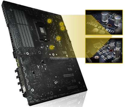 Otwory konwekcyjne Otwór konwekcyjny w obwodzie drukowanym - lepsze chłodzenie Otwory zostały rozmieszczone na płycie głównej w taki sposób, aby zwiększyć cyrkulację powietrza i zapewnić skuteczne chłodzenie tylnej części płyty głównej. Otwory konwekcyjne zmniejszają temperatury w obudowie, zwiększają stabilność i wytrzymałość systemu. |