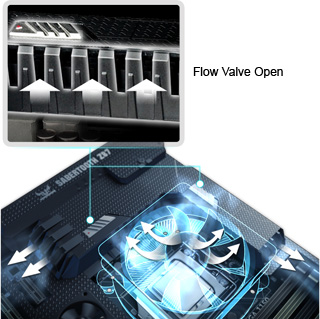 | Kiedy zawór jest otwarty, umożliwia przepływ powietrza z wentylatorów do Thermal Armor, maksymalizując wydajność systemów chłodzenia korzystających z wentylatorów. | Kiedy jest zamknięty, skupia powietrze na wydajnych przewodach cieplnych, zapewniając szybsze usuwanie ciepła. Jest to szczególnie przydatne w płynnych systemach chłodzenia | |