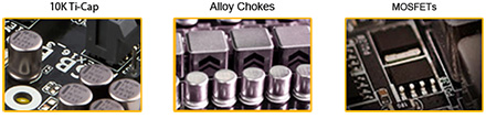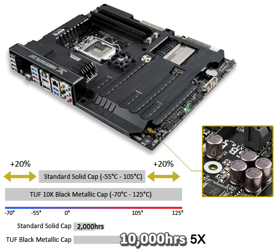 Podzespoły TUF Stworzone do pracy w ciężkich warunkach ![]() Kondensatory TUF Black Metallic, dławiki i tranzystory są poddawane siedmiu wymagającym testom wojskowym, dzięki czemu zapewniają wysoką żywotność nawet w najbardziej wymagających warunkach. |