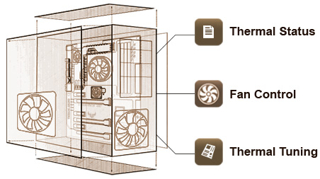 Thermal Radar 2 Kompleksowe chłodzenie systemu, regulacja wentylatorów Dzięki obecności wielu czujników na płycie oraz dołączonym kablom termistorowym możesz w czasie rzeczywistym monitorować temperatury obszarów wokół kluczowych komponentów, a nie tylko samej płyty głównej. Sterowanie wentylatorami umożliwia ręczne dostosowanie szybkości wentylatorów i uzyskanie optymalnych warunków temperaturowych jednym kliknięciem. |