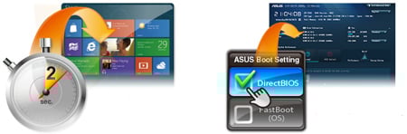 ASUS Boot Setting - kilka opcji uruchamiania Dzięki optymalizacji sprzętu ASUS-a dla Windows 8, ASUS Boot Setting oferuje większą elastyczność w dostosowaniu procesu uruchamiania komputera. Można bezpośrednio wejść do BIOS-u jednym kliknięciem w przyjaznym użytkownikowi interfejsie i szybko wybrać preferowaną metodę uruchamiania systemu: albo start systemu operacyjnego w sekundy, albo klasyczny proces uruchamiania. Bez względu na dokonany wybór, ustawienia zostaną trwale zapisane – nie trzeba podejmować decyzji przy każdym włączaniu maszyny. |