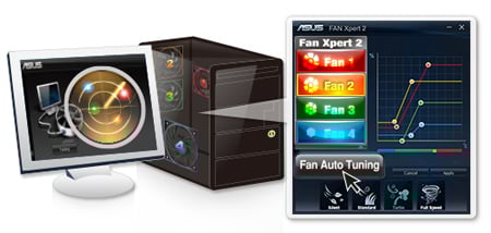 Fan Xpert 2 Wszechstronna kontrola zapewniająca skuteczne chłodzenie i cichą pracę. ASUS Fan Xpert 2 z trybem Fan Auto Tuning, umożliwia osobną regulację prędkości każdego 4- i 3-pinowego wentylatora procesora i obudowy z automatycznym wykrywaniem prędkości wentylatorów. Umożliwia to osiągnięcie najlepszej możliwej równowagi pomiędzy wydajnością chłodzenia, a głośnością pracy. Posiada również funkcję RPM FixedMode, która redukuje hałas do poziomu niemal 0dB oraz odpowiednio dostosowuje prędkości wentylatorów. |