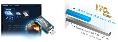 Nowa technologia ASUS USB 3.0 Boost obsługuje UASP (USB Attached SCSI Protocol), najnowszy standard USB 3.0. Dzięki technologii USB 3.0 Boost urządzenie USB może ulec przyspieszeniu nawet do 170% przy i już niezwykle szybkich transferach USB 3.0. Oprogramowanie firmy ASUS automatycznie przyspiesza prędkość transferu danych w kompatybilnych urządzeniach peryferyjnych USB 3.0 bez jakiejkolwiek ingerencji ze strony użytkownika. |