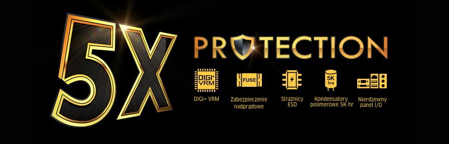 Wszechstronna ochrona zapewnia najwyższą jakość, niezawodność i wytrzymałość Płyty główne firmy ASUS chronią komputer za pomocą 5X PROTECTION Stosujemy najlepsze komponenty, takie jak cyfrowy system DIGI+ VRM oferujący precyzyjne zasilanie procesora, moduły ESD poddawane surowym testom i eliminujące zakłócenia elektrostatyczne, jak również resetowalne bezpieczniki wokół gniazd DRAM, które zapobiegają uszkodzeniom w wyniku spięć i przetężeń. Wykorzystujemy też odporne na korozję osłony I/O. Są to przykłady tego, jak firma ASUS zapewnia najwyższa możliwą niezawodność i wytrzymałość produktów. |