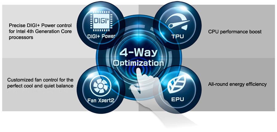 Technologia Dual Intelligent Processors 4 z czteroelementową optymalizacją 4-Way Optimization Jedno kliknięcie, by uzyskać lepszą wydajność, efektywność, cyfrowe sterowanie zasilaniem, zmniejszony hałas i usprawnione chłodzenie. 4 główne filary regulacji