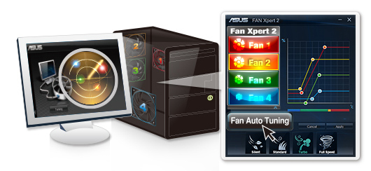 Fan Xpert 2 Wszechstronna kontrola zapewniająca skuteczne chłodzenie i cichą pracę ASUS Fan Xpert 2 z trybem Fan Auto Tuning, umożliwia osobną regulację prędkości każdego 4- i 3-pinowego wentylatora procesora i obudowy z automatycznym wykrywaniem prędkości wentylatorów. Umożliwia to osiągnięcie najlepszej możliwej równowagi pomiędzy wydajnością chłodzenia, a głośnością pracy. Posiada również funkcję RPM FixedMode, która redukuje hałas do poziomu niemal 0dB oraz odpowiednio dostosowuje prędkości wentylatorów. |