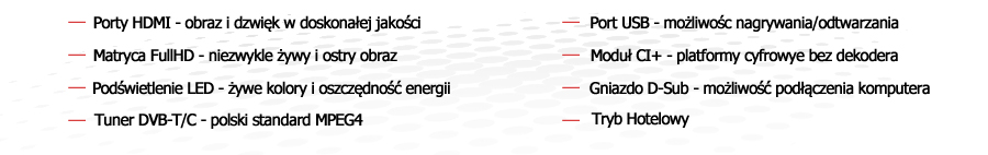 Podświetlenie LED Zapewnia niepowtarzalną jakość obrazu, który nabrał niespotykanej wcześniej ostrości i wyrazistości. Technologia LED to oszczędność energii oraz smukła, lekka i elegancka obudowa. Technologia LED zapewni niezapomniane wrażenia z oglądanego obrazu. |