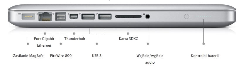 Porty pełne możliwości. Korzystając z portu Thunderbolt, możesz kaskadowo połączyć maksymalnie sześć urządzeń — w tym monitor Apple Thunderbolt Display i urządzenia z wejściem Mini DisplayPort — przekształcając notebooka w rozbudowane stanowisko pracy. Obsługa wideo i ośmiokanałowego dźwięku ułatwia podłączanie urządzeń zgodnych ze standardem HDMI — takich jak telewizor i domowy zestaw stereo — za pośrednictwem przejściówki HDMI (sprzedawanej osobno). Obsługiwane są też obecne przejściówki VGA, DVI i DisplayPort. Dwa nowe porty USB 3 pozwalają na przesyłanie danych z szybkością 10 razy większą niż porty USB 2. Ale oczywiście możesz do nich bez problemu podłączyć swoje urządzenia USB 2. Pomyślano także o porcie dla urządzeń z interfejsem FireWire 800. Zaś gniazdo na karty SDXC obsługuje karty o maksymalnej pojemności 64 GB i pozwala na wygodne, błyskawiczne przenoszenie zdjęć z i na MacBooka Pro, gdy tylko zechcesz je edytować lub zaprezentować. |