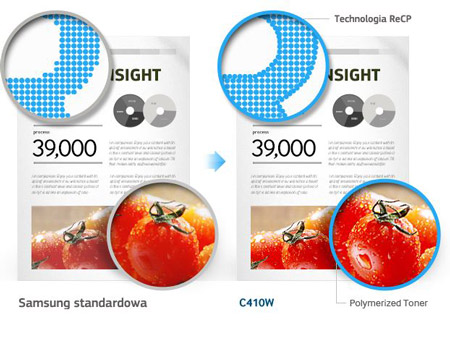 Doskonała jakość wydruków Tekst, wykresy i zdjęcia – drukarka C410W pomoże ci wydrukować co tylko zechcesz w jakości, która spełni nawet najwyższe oczekiwania. Rozdzielczość 600 x 600 dpi można zwiększyć nawet do 2 400 x 600 dpi poprzez zróżnicowanie rozmiaru i rozmieszczenia punktów. To oznacza, że twoje wydruki będą cechować się bogactwem detali i ostrością. Unikalna technologia ReCP (Rendering Engine for Clean Page), opracowana przez firmę Samsung, poprawia jakość kolorów i zapewnia perfekcyjne wydruki za każdym razem. |
